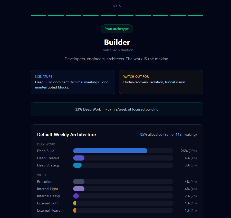 Take the work profile quiz to find your baseline. Axis converts your behavioral profile into a weekly architecture — when you focus best, what kinds of work you do, how many hours are realistic.