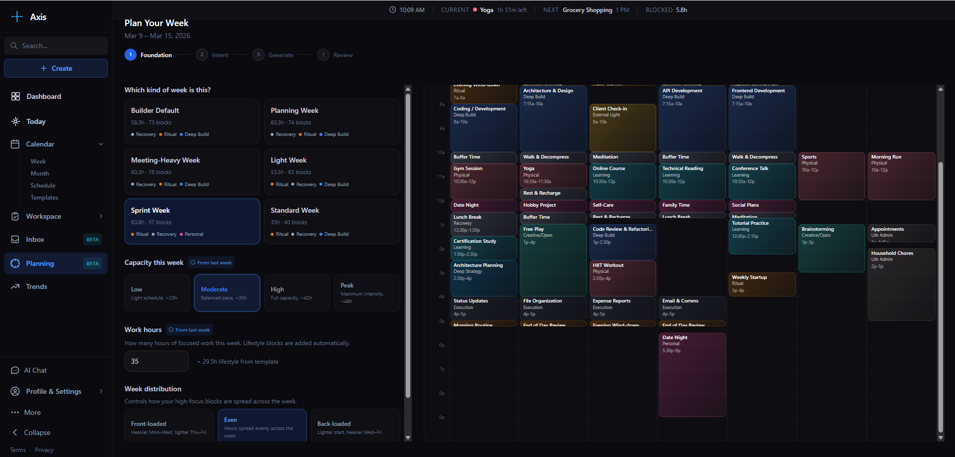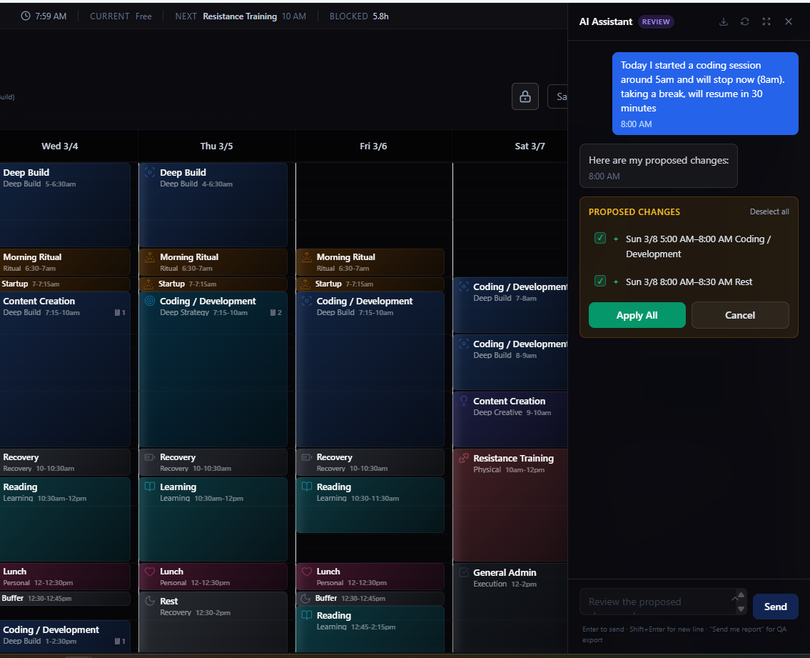 Choose the type of week and your capacity. Axis builds a schedule that balances deep work, execution, learning, and recovery — then suggests adjustments before you commit.