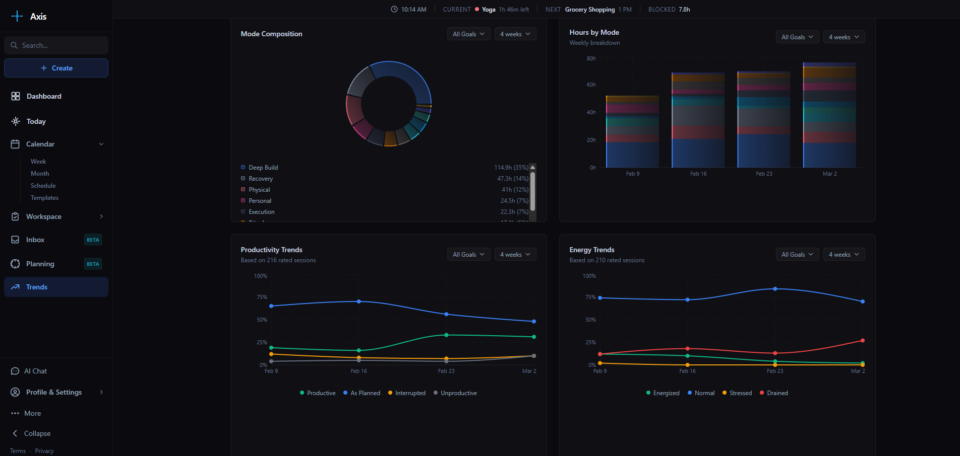 The trends dashboard shows where your attention actually goes — hours by domain, mode composition, productivity and energy patterns over time.