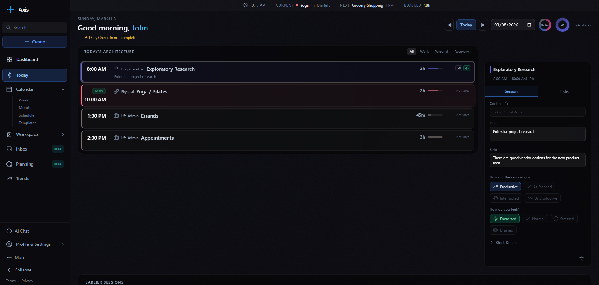 The day view strips away the noise. You see today’s blocks, the current session, and a place to capture feedback. Every block feeds the system.