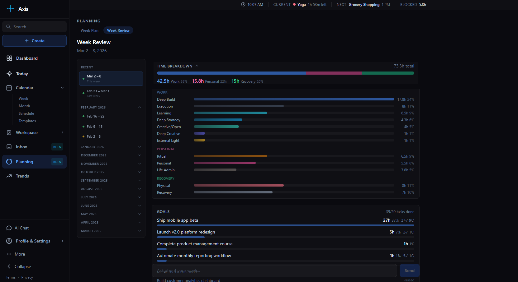 Axis is built around a weekly cadence. You design a week structure, live it, give feedback on how it went, and the system learns from that over time. Here's what that looks like in practice.